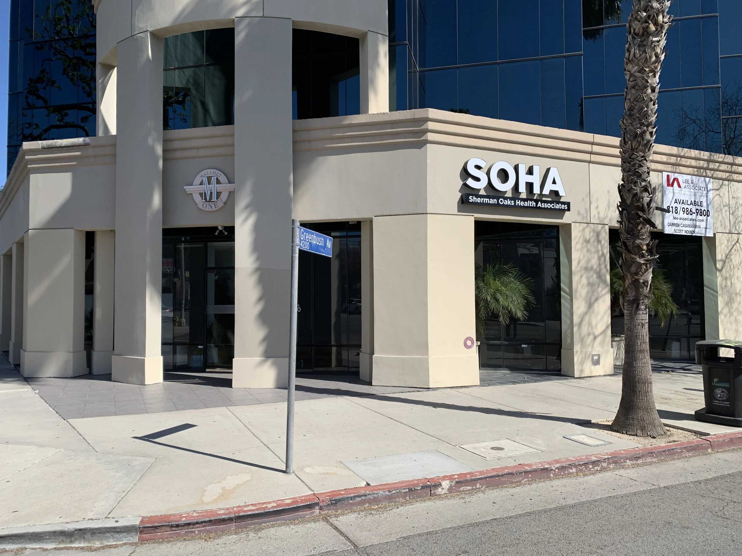 On the corner of Ventura Blvd and Greenbush Avenue. Complimentary parking located on Greenbush Avenue.